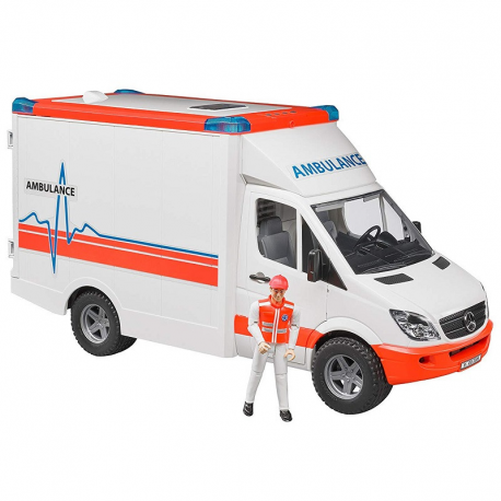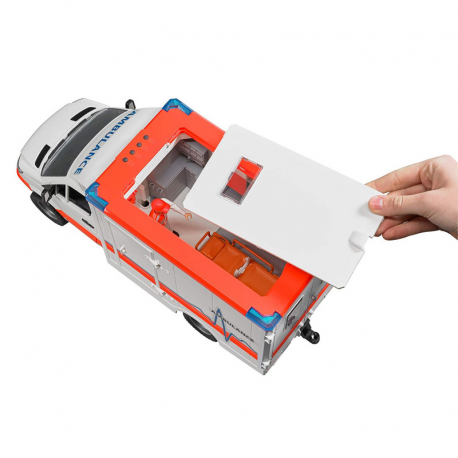 Pojazd posiada ruchome elementy takie jak: otwierane drzwi boczne, otwierane drzwi tylne oraz zdejmowalny dach. Ambulans został bardzo dobrze odwzorowany, wygląda jak prawdziwy pojazd pogotowia ratunkowego. Wnętrze karetki jest wyposażone, znajduje się tam miejsce dla kierowcy a w drugiej części, miejsce dla ratownika i sprzętu medycznego. Zmieści się tam też łóżko szpitalne do transportu chorego pacjenta. Całość osadzona została na, wytrzymałych, gumowych kołach. Dodatkową atrakcją jest moduł świetlno-dźwiękowy. Po uruchomieniu pojazd wydaje dźwięki i świecą się światła pojazdu uprzywilejowanego. Istnieje możliwość dołączenia do pojazdu innych maszyn lub przyczepek marki Bruder.
