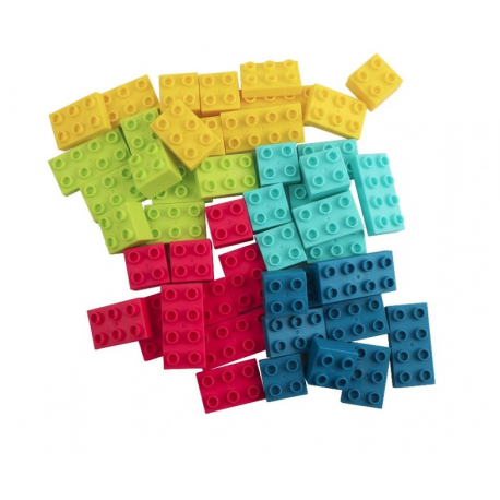 W zestawie znajduje się 50 kolorowych, elastycznych klocków. Klocki są rozciągliwe, lekkie i dostosowane do małych rączek dziecka. Maluszek może brać je do buzi, bawić się nimi w wannie czy na dywanie w pokoju. By nie zniechęcać dziecka kolorowe elementy łatwo się ze sobą łączą. W razie zabrudzenia wszystkie elementy można czyścić w gorącej wodzie do 100 stopni.
