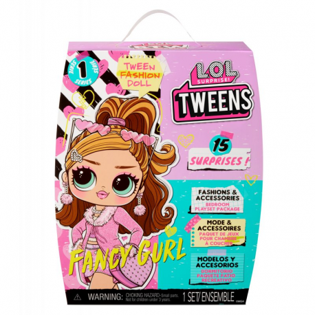 W zestawie znajduje się laleczka Fancy Gurl i aż 15 niespodzianek! Oprócz lalki w środku można znaleźć również: ubrania, buty, akcesoria, pudełko na kapelusze, szczotkę do włosów, torbę na ubrania, naklejkę, wieszak i stojak.