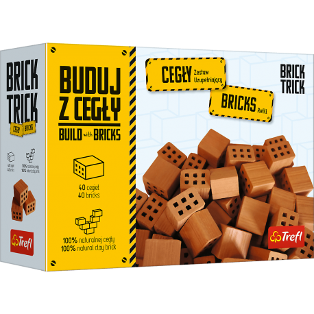 Zestaw uzupełniający Brick Trick to produkt kreatywnych zabawek, w której głównym budulcem jest prawdziwa, naturalna cegła. Zestaw składa się z 40 prawdziwych, naturalnych cegiełek podłużnych. Zestaw uzupełniający to doskonałe rozwiązanie dla osób, które chcą poszerzyć posiadane już zestawy podstawowe i tworzyć zupełnie nowe, większe konstrukcje.