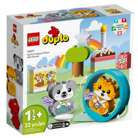 Zestaw LEGO® DUPLO® Mój pierwszy szczeniak i kotek z odgłosami (10977) pozwala dzieciom w wieku od 18 miesięcy uczyć się podczas zabawy i rozwijać umiejętności.