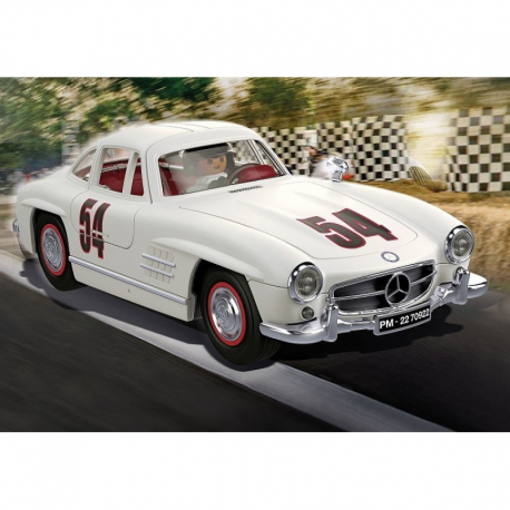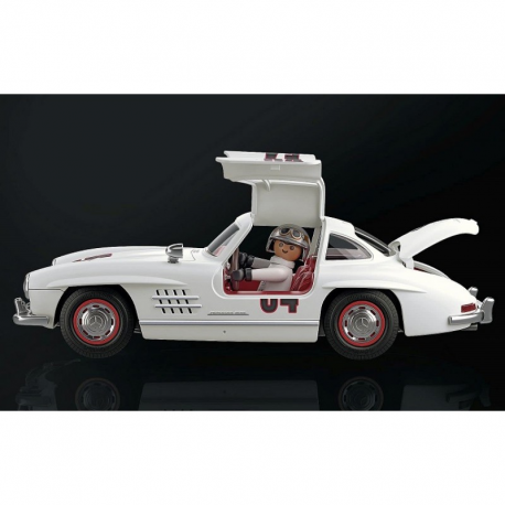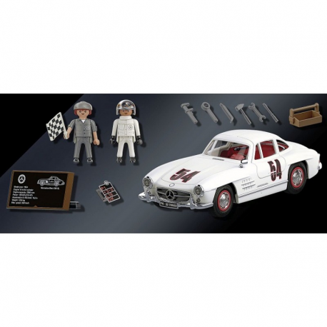 W zestawie znajduje się ekskluzywny biały samochód Mercedes-Benz 300SL.