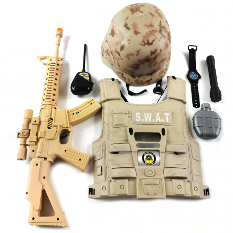 Zestaw zawiera: kask, kamizelkę, karabin, imitację granatu, krótkofalówki, zegarka oraz latarki.