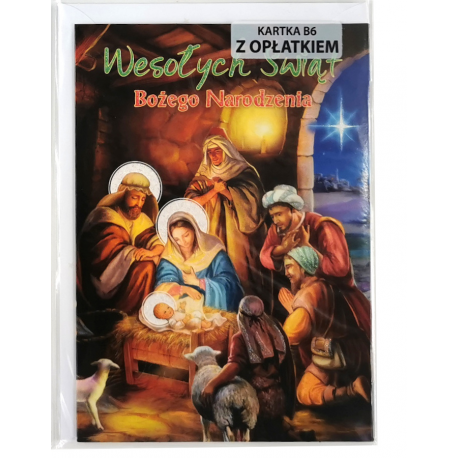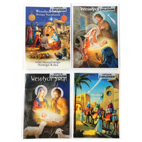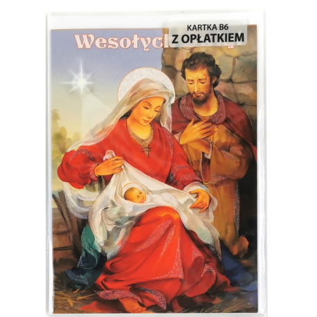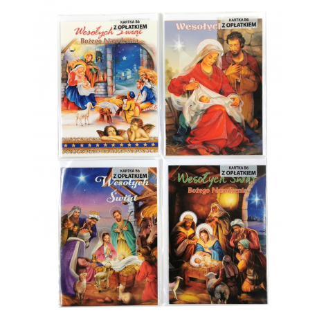 Kartki zawierają nadruk przedstawiający świętą rodzinę oraz białą kopertę z nadrukiem przedstawiającym stroik świąteczny.