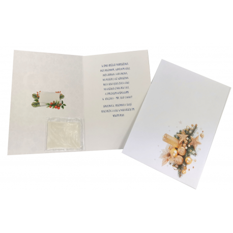 W środku znajduje się opłatek oraz życzenia świąteczne i noworoczne.