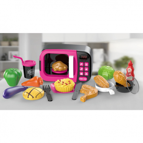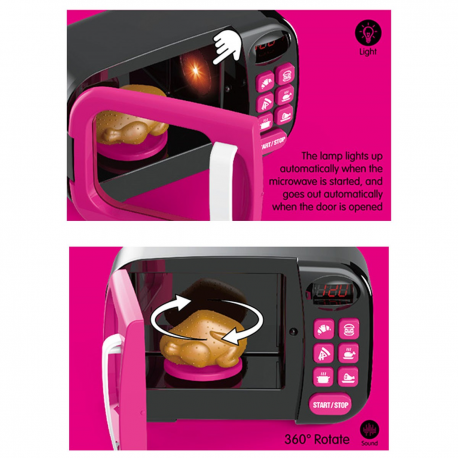 Interaktywna mikrofalówka zasilana jest bateriami. Posiada efekty świetlne i prawdziwy timer. Po wciśnięciu przycisku start zaświeci się światło a talerz zacznie się obracać.