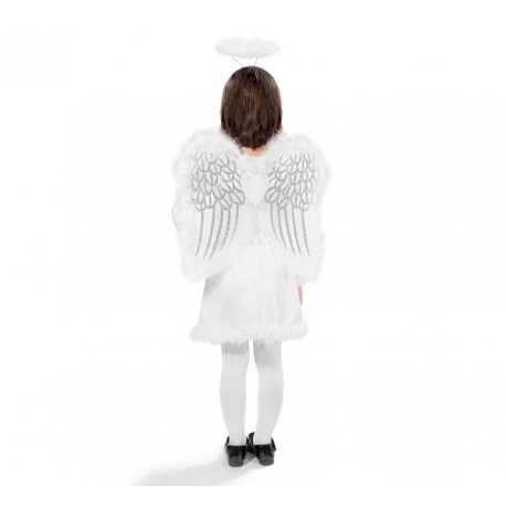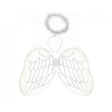 W zestawie znajdują się białe skrzydełka zakładane za pomocą elastycznych gumek i aureolka.