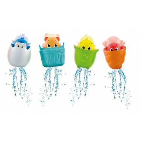Kiedy słodkie stworzenia są zanurzone pod wodą, nagle się pojawiają: krab wychodzi ze skorupy, pingwin wychodzi z jajka, a kaczka i niedźwiedź wyskakują z wanny i misy.