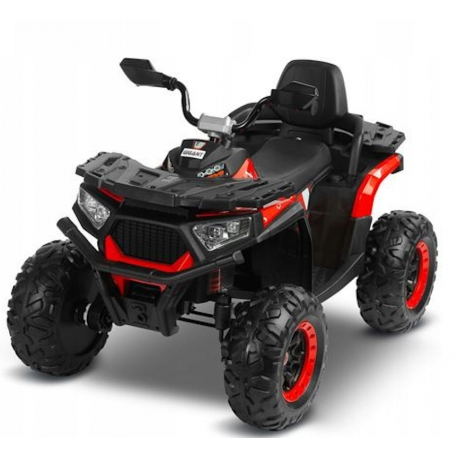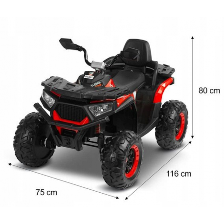 Wygodę czterokołowca zapewnia obszerne siedzisko z ekoskóry. Cztery mocne silniki 45 W i duże koła z wysokiej jakości pianki EVA sprawiają, że GIGANT bez problemu poradzi sobie z nierównym terenem.