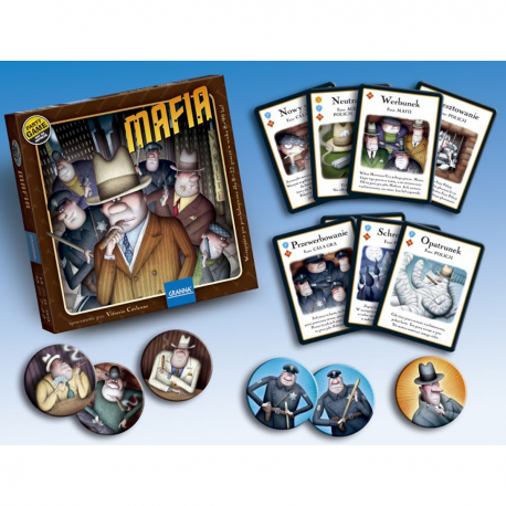 MAFIA to wciągająca gra psychologiczna oparta na schemacie popularnej gry towarzyskiej. Mogą bawić się w nią dorośli i dzieci, doskonale sprawdza się na wszelkiego rodzaju imprezach, wyjazdach integracyjnych, obozach, w świetlicach itp. Jej unikalna formuła umożliwia jednoczesną wspólną zabawę dużej grupie graczy. Zestaw zawiera żetony używane w podstawowej wersji gry, a także karty umożliwiające zaawansowanym graczom intrygujące rozszerzenie reguł