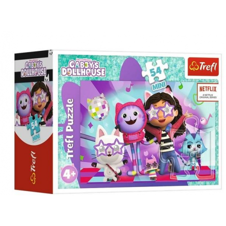 W zestawie znajdują się 54 elementy mini puzzli z ilustracją przedstawiającą bohaterów serialu animowanego Koci domek Gabi.