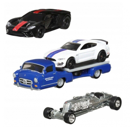 W zestawie znajdują się trzy metalowe samochodziki w skali 1:64 i jeden pojazd Team Transport.