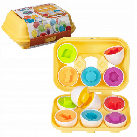 Zabawa polega na dopasowaniu do siebie dwóch połówek w taki sposób aby tworzyły całość. Wbrew pozorom nie jest to proste zadanie, aby jajeczka się połączyły należy dopasować je kształtem i kolorem.