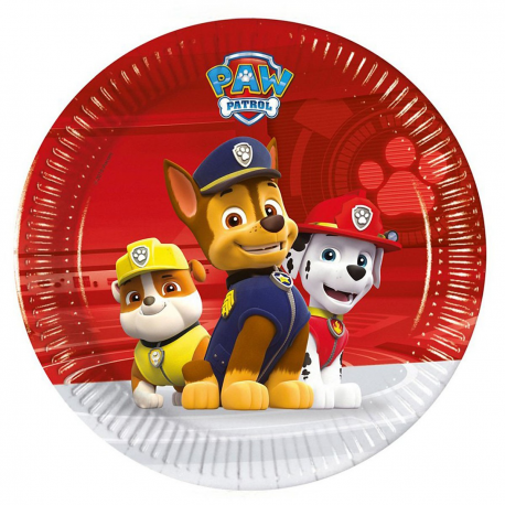 Opakowanie zawiera 8 papierowych talerzyków z kolorowym nadrukiem przedstawiającym bohaterów serialu animowanego Psi Patrol.