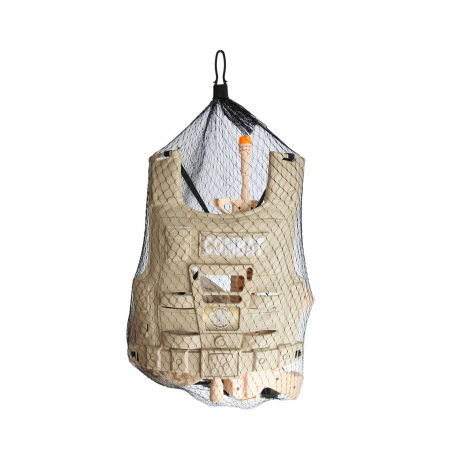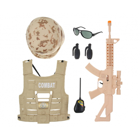W skład zestawu wchodzą: kamizelka kuloodporna (ochrona balistyczna), dwa granaty, czarne okulary, hełm, atrapa krótkofalówki oraz karabinek z lunetą.