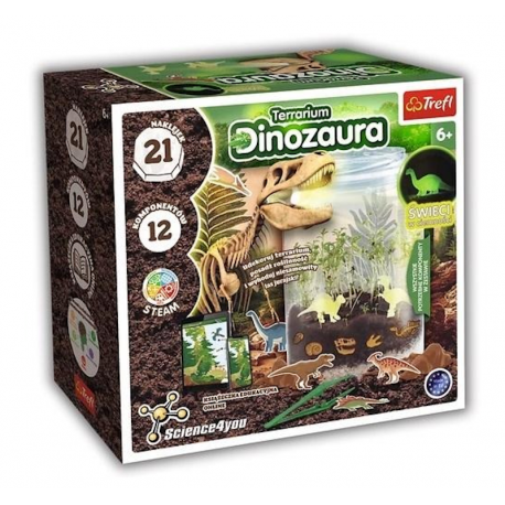 Udekoruj terrarium, posadź roślinność i wyhoduj niesamowity las jurajski z zestawem Terrarium Dinozaura marki Science4you! Obserwuj, jak kiełkują nasiona i podlewaj ziemię, gdy wyschnie. Udekoruj terrarium naklejkami, aby stworzyć niesamowity ekosystem. Włóż figurki dinozaurów i zgaś światło, aby zobaczyć jak świecą w ciemności! Dowiedz się, jakie było środowisko, w którym żyły dinozaury. Czy wiesz, jakie rośliny i zwierzęta istniały w okresie jurajskim? Wszystkie potrzebne komponenty są zawarte w zestawie.
