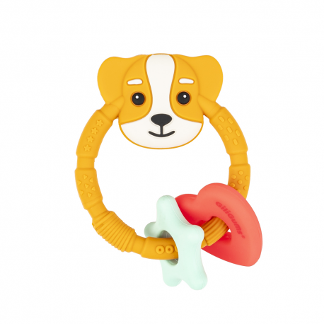 Gryzaczek jest, lekki i łatwy do chwytania przez małe rączki. Na obręczy znajdują się zróżnicowane wypustki, a poza psią główką, gryzak zdobią jeszcze dwa ruchome elementy serduszko i gwiazdka.