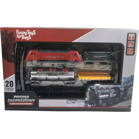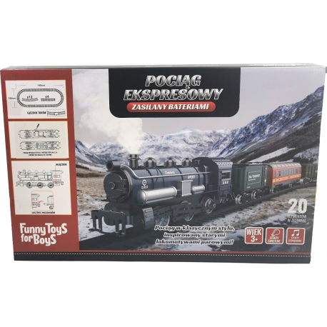 Kolorowa lokomotywa z doczepianymi wagonikami. Podczas jazdy świeci przednim światłem i wydaje odgłosy jadącego pociągu a jej koła napędowe wyposażone są w gumki zapobiegające ślizganiu się kolejki po torach.