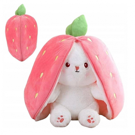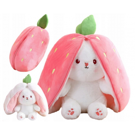Może pełnić aż 3 funkcje! Będąc jednocześnie maskotką do przytulania króliczkiem, maskotką truskawką oraz poduszką.