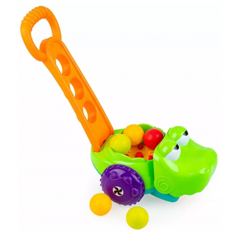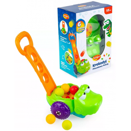 Krokodylek – głodomorek połyka piłeczki! Rozrzuć je na podłodze i pozbieraj wszystkie za pomocą tego zabawnego zwierzaka. Możesz się z nim bawić na dwa różne sposoby: statycznie, przekładając piłeczki z grzbietu do otworów, znajdujących się na rączce do prowadzenia, lub dynamicznie, prowadząc krokodylka przed sobą i zbierając nim piłeczki, której to czynności towarzyszą wesołe melodie. Rączka do prowadzenia jest odpinana, co ułatwia przechowywanie zabawki.