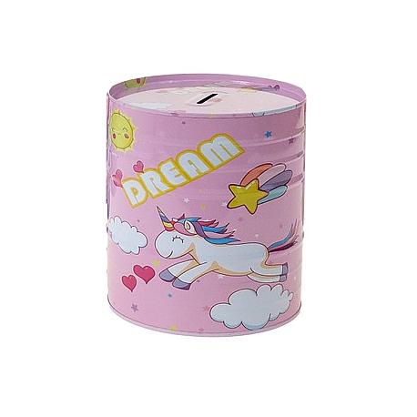 Skarbonka ma kształt puszki i żywą kolorystykę, która przyciąga uwagę.