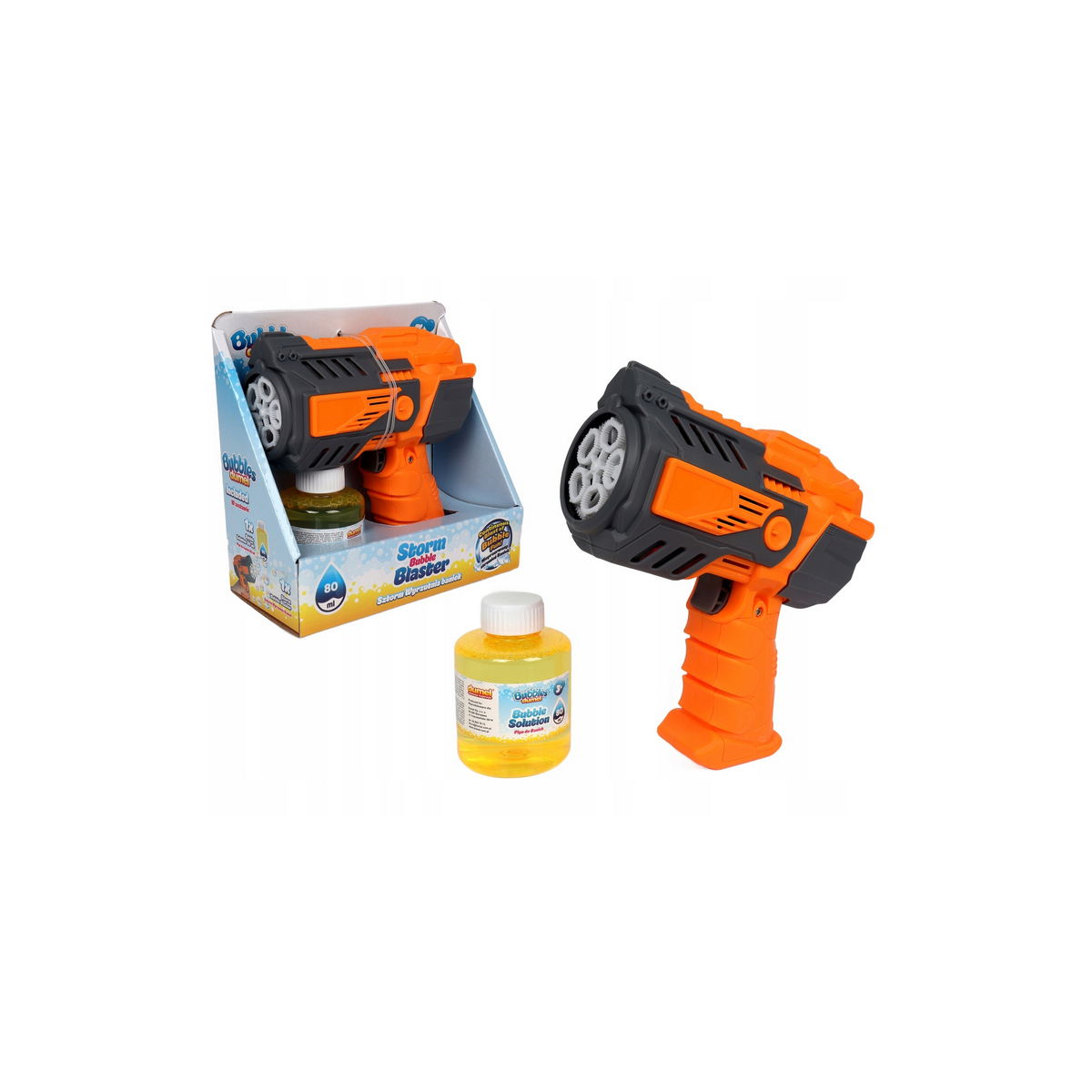 Zabawka wyprodukuje duży strumień baniek. W zestawie, poza wyrzutnią, znajduje się płyn o pojemności 80 ml, który należy wkręcić do wyrzutni przed rozpoczęciem zabawy. Zabawka zasilana jest bateriami.