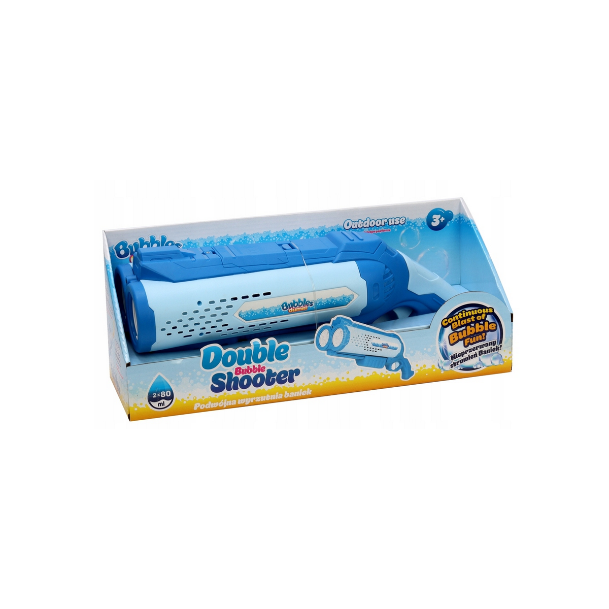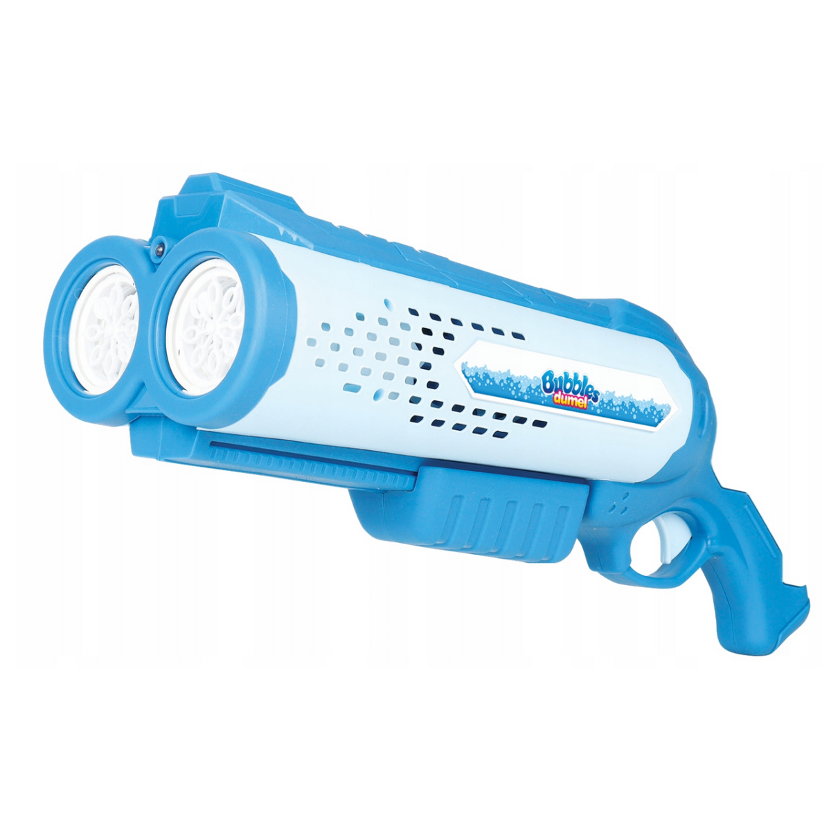 Podwójnie dobra zabawa z dwa razy większą ilością baniek! Wyrzutnia posiada aż dwie lufy, a do tego wyposażona jest w światełko, które tworzy lekko niebieską poświatę. Aby rozpocząć zabawę wkręć buteleczkę z płynem do nakrętki z wężykami, znajdującej się w górnej części wyrzutni. Następnie przytrzymaj dłużej spust i ciesz się podwójnym strumieniem baniek. Zabawka przeznaczona jest do używania na świeżym powietrzu. Płyn można dokupić oddzielnie w dwóch pojemnościach do wyboru.