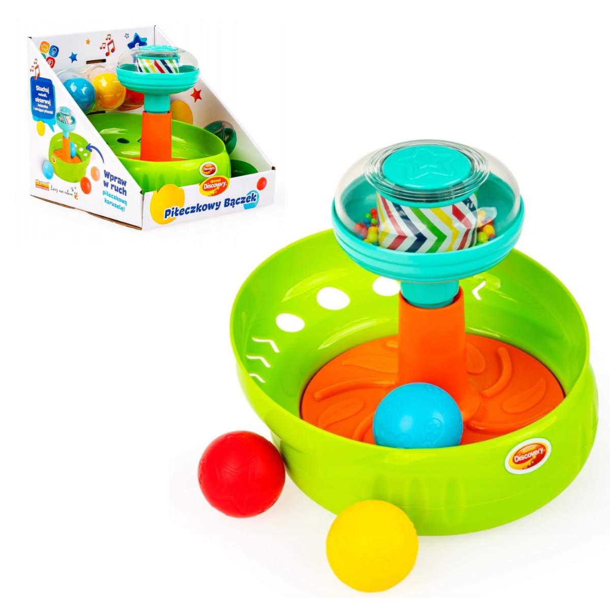 Bączek wyposażony został w melodie i światełka, które to funkcje aktywuje wciśnięcie tłoka. W zestawie znajdziemy trzy piłeczki, a każda z nich ozdobiona jest innymi, wytłoczonymi kształtami: czerwona gwiazdkami, żółta listkami, a niebieska motylkami. Także szczyt tłoka zdobi kształt gwiazdki, a w jego przezroczystej kopule ukryło się mnóstwo kolorowych koralików, które uroczo grzechoczą przy wciskaniu tłoka lub poruszaniu zabawką.
