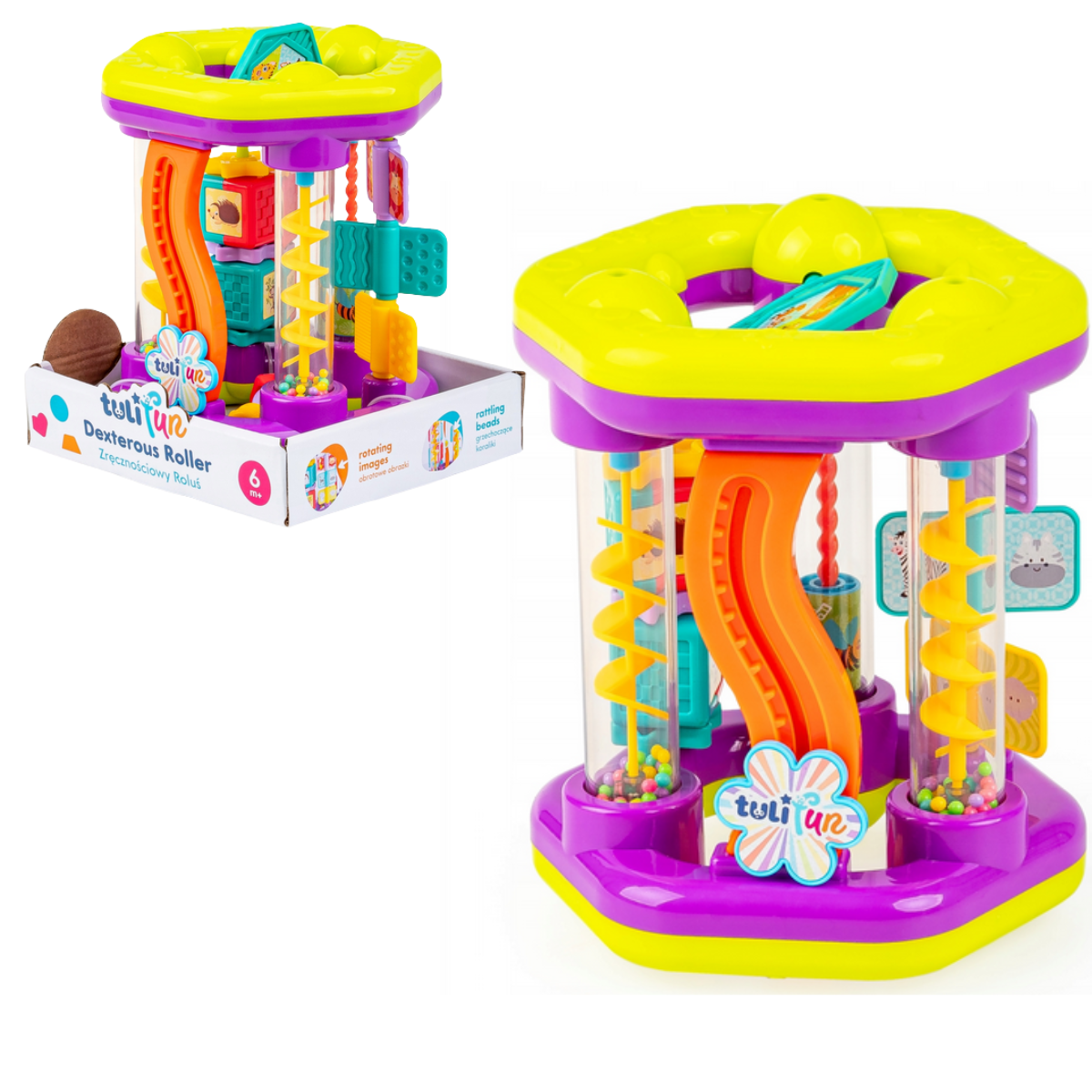 Na każdej ze ścianek Rolusia znajduje się inna zabawa, aktywizująca małe rączki. Znajdziemy tu kwiatek do przesuwania, obrazki zwierzątek do obracania, grzechotki, bezpieczne lusterko, a nawet zjeżdżalnie z koralikami. Wszystkie te ruchome i grzechoczące elementy mają za zadanie jak najlepiej stymulować zmysły maluszka, zachęcając go przy tym do aktywnej, sensorycznej zabawy!