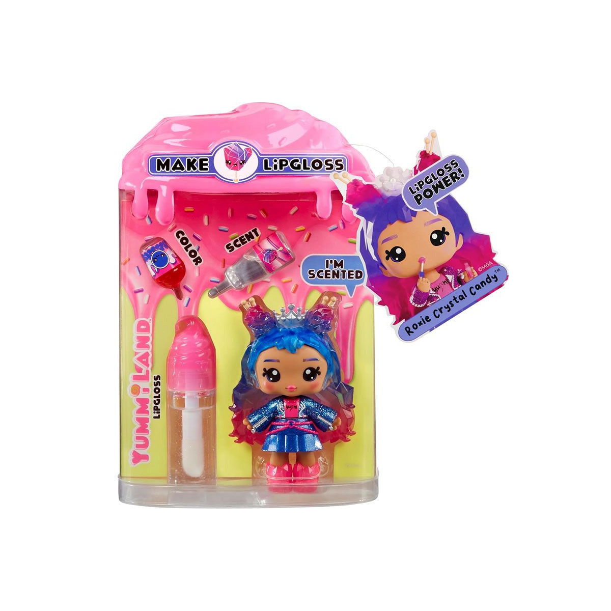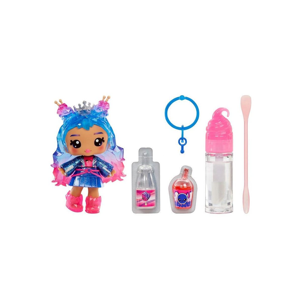 Zestaw zawiera: 10-centymetrową lalkę, zestaw do samodzielnego robienia błyszczyku z drobinkami, pachnący płyn, kolorowy płyn, łyżeczkę do mieszania oraz zawieszkę do kluczy.