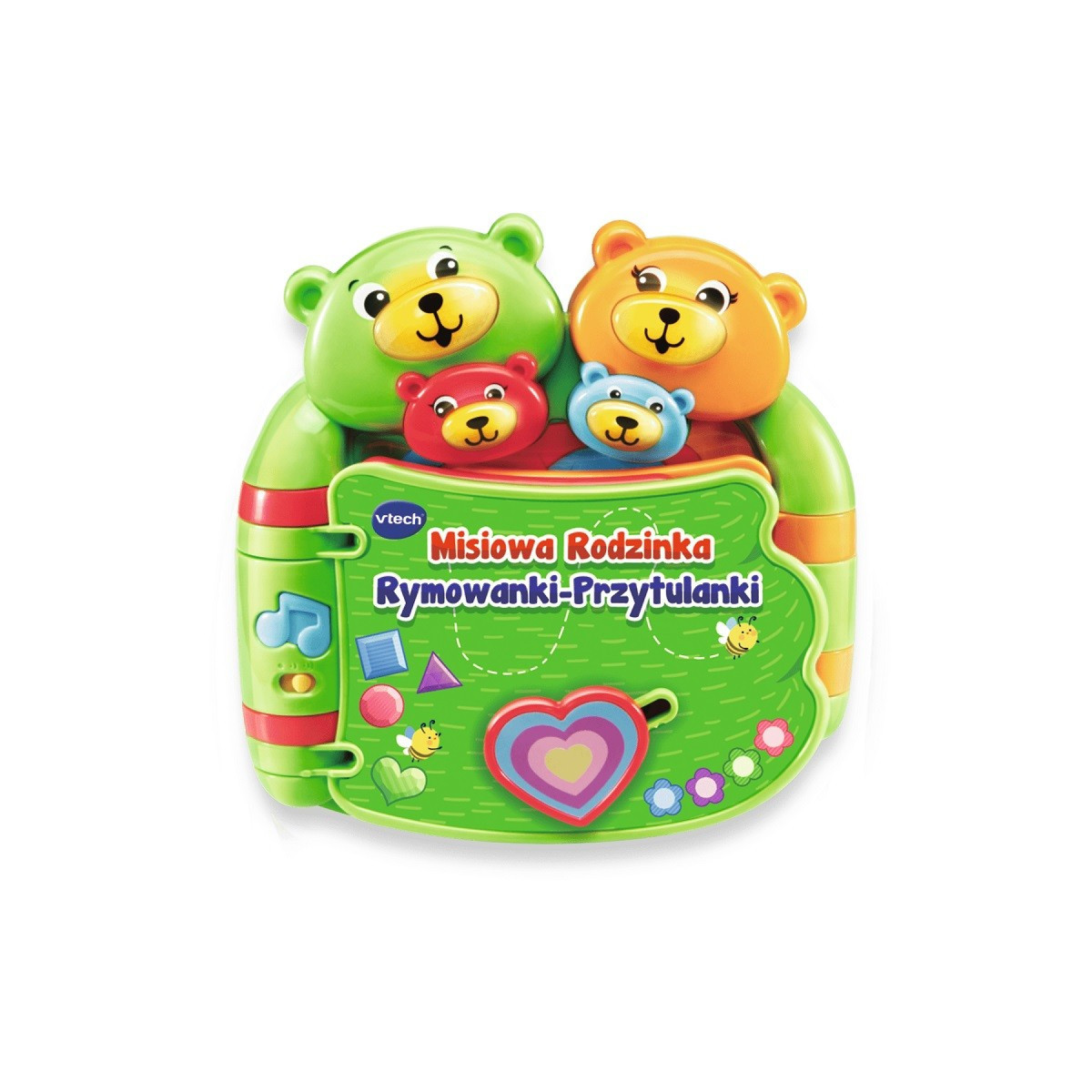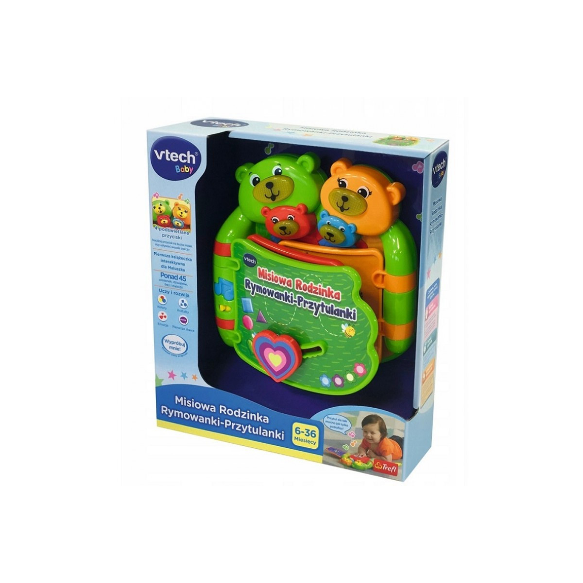 Urocza książeczka opowiadająca o relacjach Misiowej Rodziny. W książeczce znajdziemy 6 starannie zaprojektowanych, interaktywnych, kolorowych stron opowiadających historię Misiowej Rodziny. Na każdej ze stron znajduje się ciekawa historia o każdym członku rodziny 6 kolorowych przycisków uruchamia urocze zwroty i piosenki. Przycisk Melodii uczy kształtów, liczenia oraz kolorów. Na brzuszku Misiowego Brata znajduje się przycisk chichotania, wystarczy przesunąć przycisk w górę i w dół, aby posłuchać wesołego chichotu 4 urocze przyciski w postaci buziek Misiów - każda buźka Misiowej Rodziny jest podświetlana oraz wygrywa słodkie rymowanki.