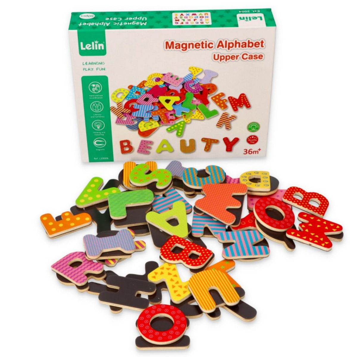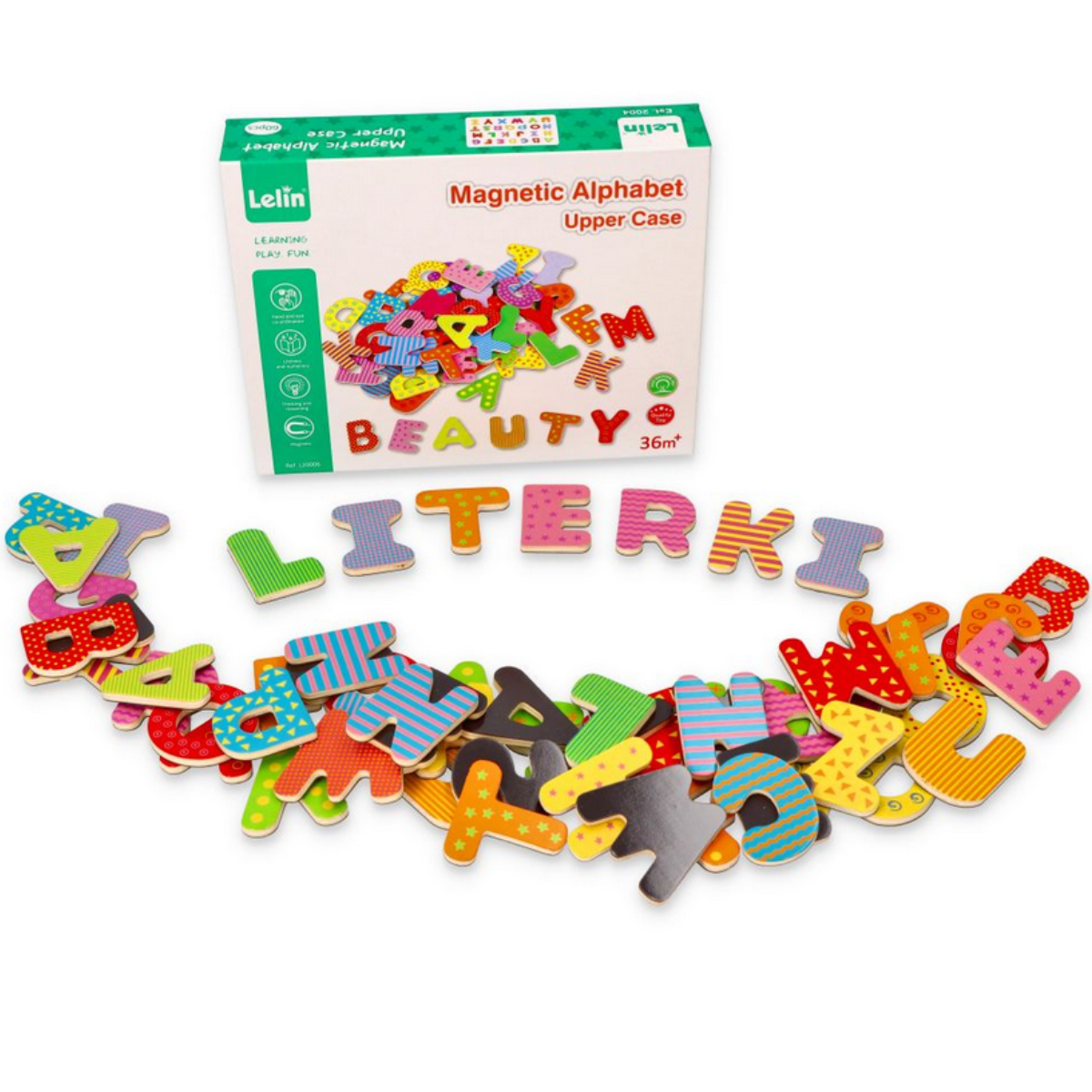 Komplet zawiera 60 sztuk drewnianych magnetycznych literek.