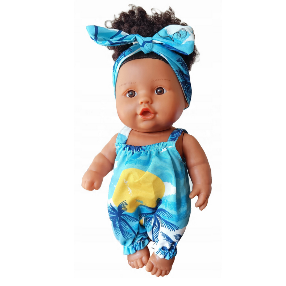 Urocza lalka ma ciemną karnację i brązowe oczka. Na głowie ma bujne czarne loczki.