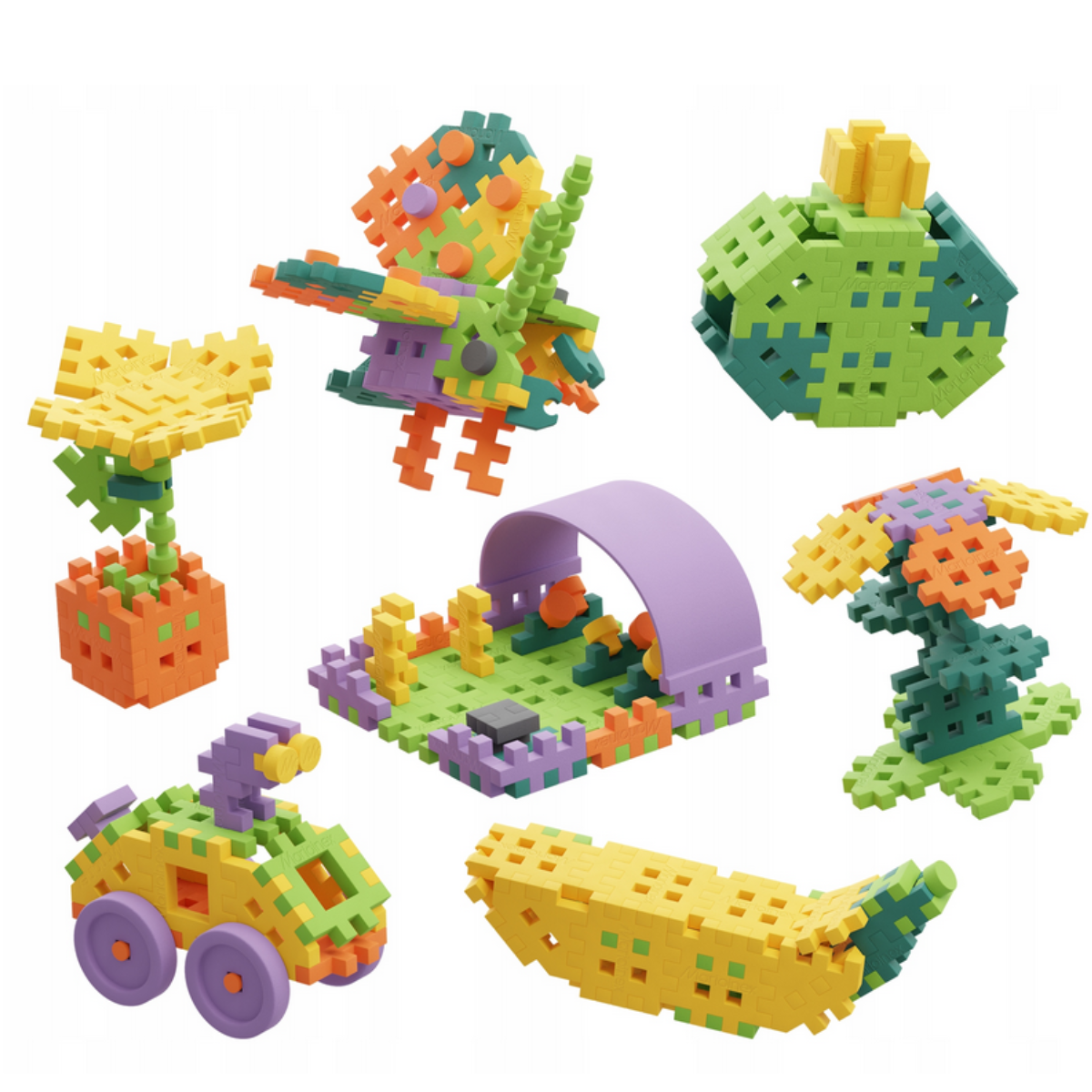 Dzięki unikalnemu, miękkiemu materiałowi i charakterystycznemu „wafelkowemu” kształtowi, dzieci mogą łatwo łączyć elementy w przestrzenne budowle, pojazdy, postacie i wszystko, co tylko podpowie im wyobraźnia.