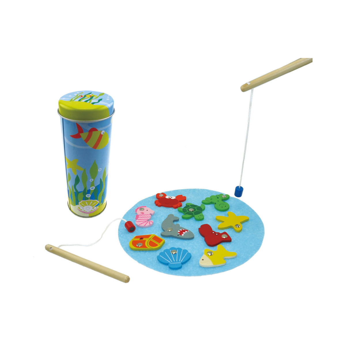 W zestawie: metalowy pojemnik na rybki, 2 wędki z magnesem, plansza, 10 rybek