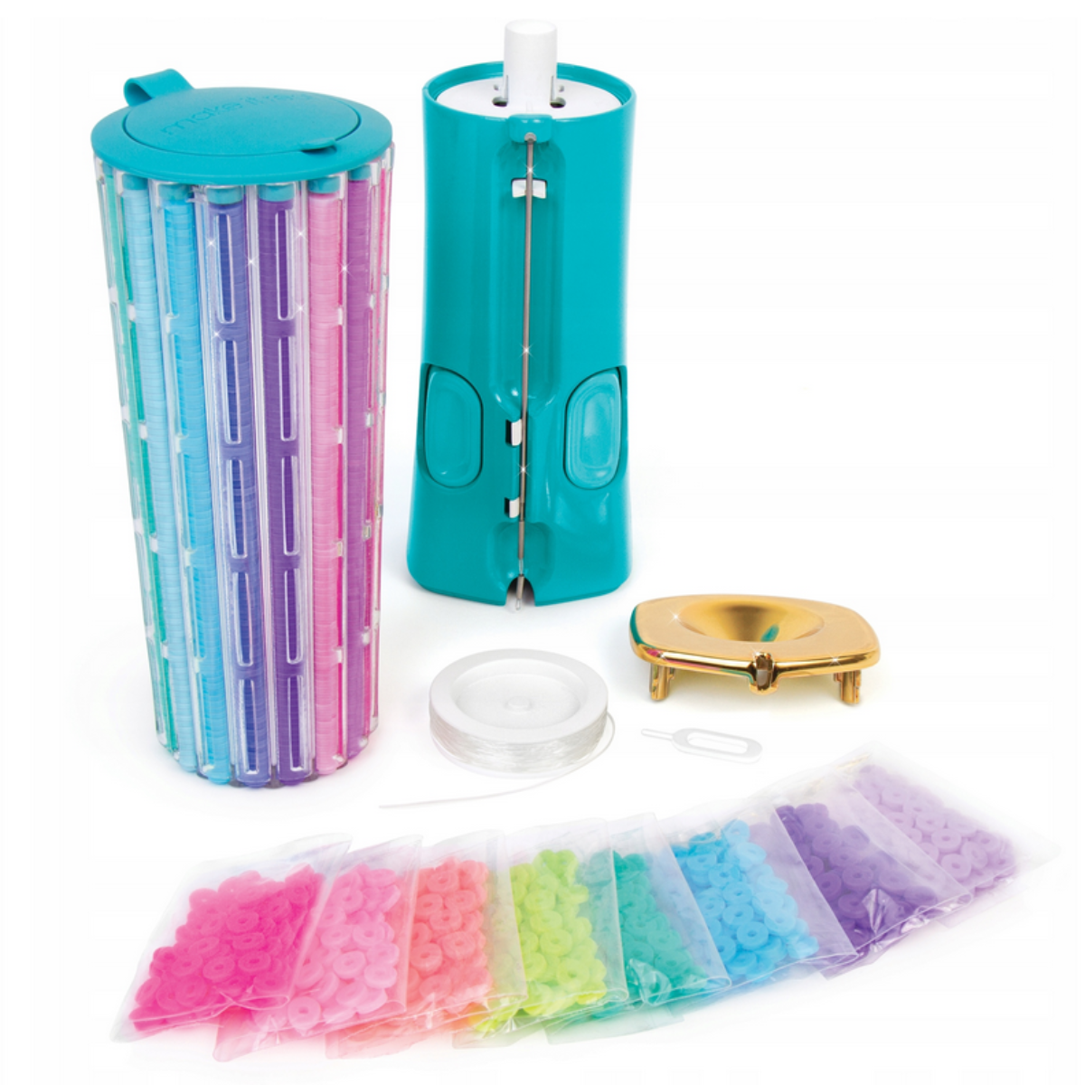 Łatwo wykonasz 23 bransoletki z koralików w 16 kolorach, obracając karuzelę z koralikami, aby ustawić żądany kolor nad paskiem do nawlekania.