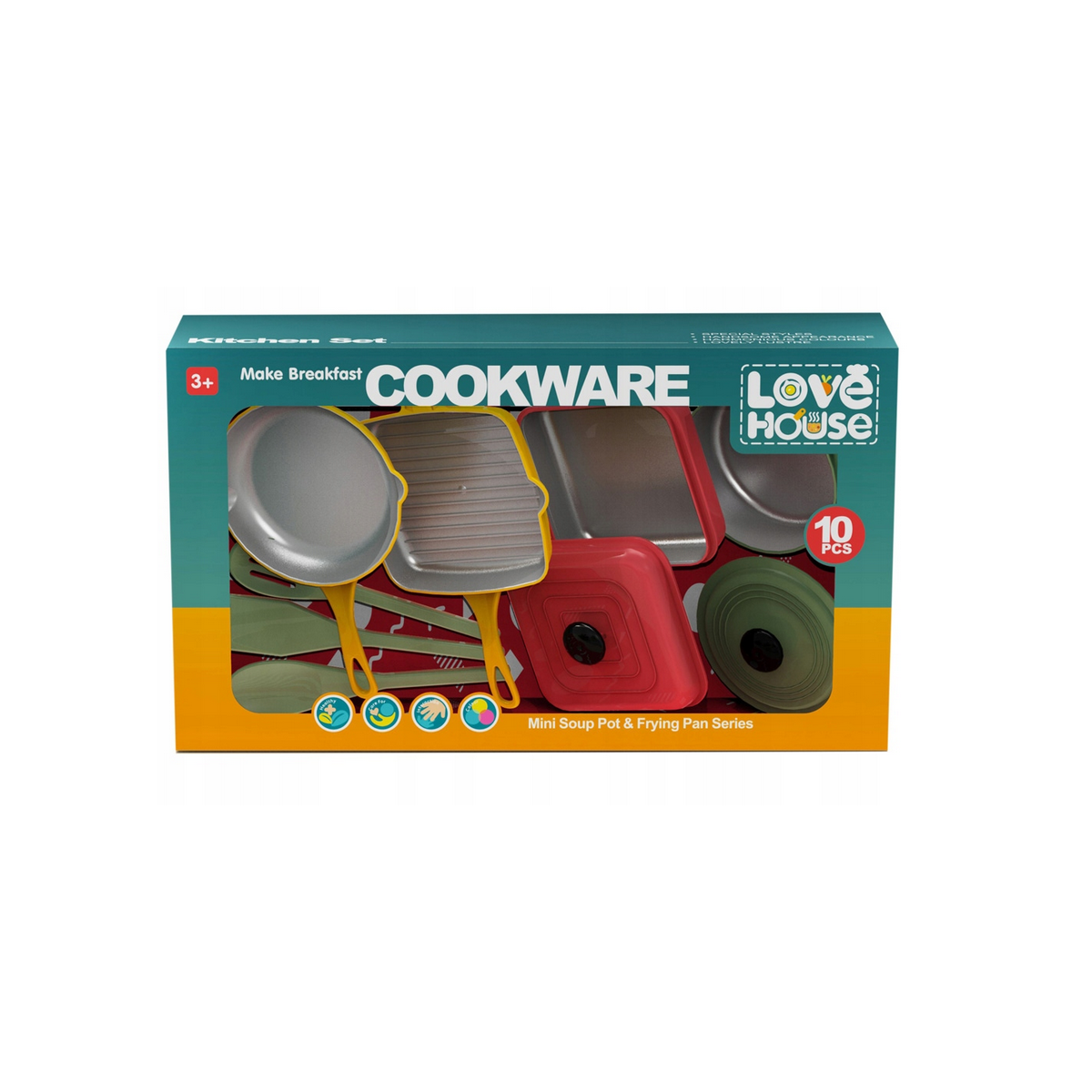 Zestaw zawiera różnorodne garnki, patelnie, pokrywki oraz przybory kuchenne, które rozwijają wyobraźnię, zdolności manualne i uczą współpracy podczas wspólnej zabawy.