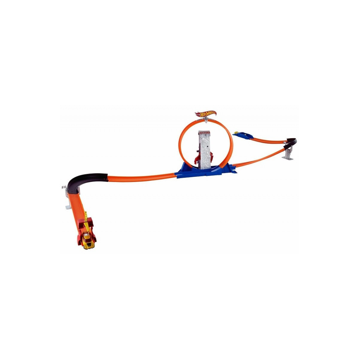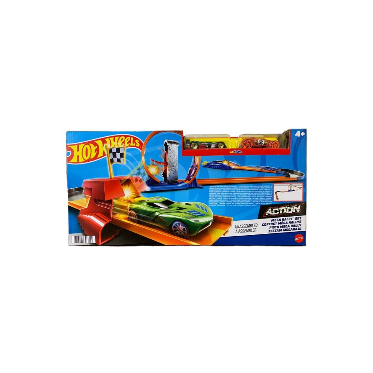 Zakręconą zabawę rozpoczniesz od razu po otwarciu opakowania – znajdziesz w nim tory, zakręty z bandami, wyrzutnie, flagi do oznaczenia mety, unoszone rampy i dwa samochodziki Hot Wheels®!