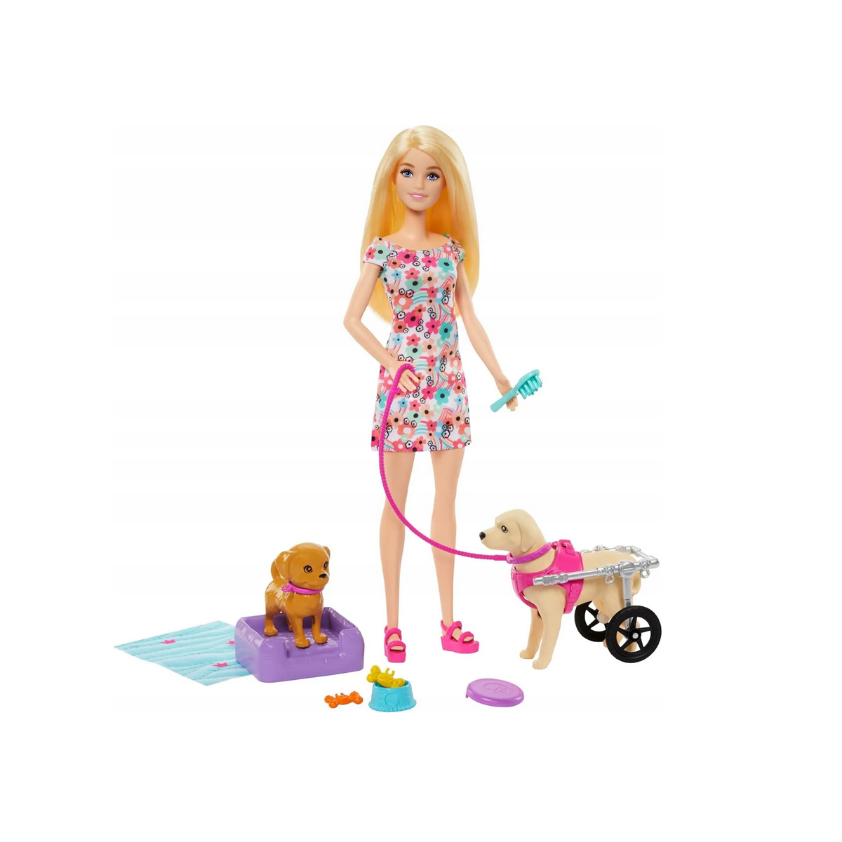 Barbie ma wszystko, czego potrzeba, aby zająć się pupilami, w tym miseczkę na jedzonko, obroże, legowisko i smycz do trzymania w dłoni. Lalka nie stoi samodzielnie. Kolory i elementy dekoracyjne mogą się różnić.