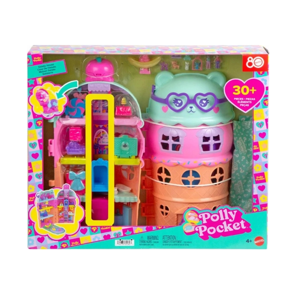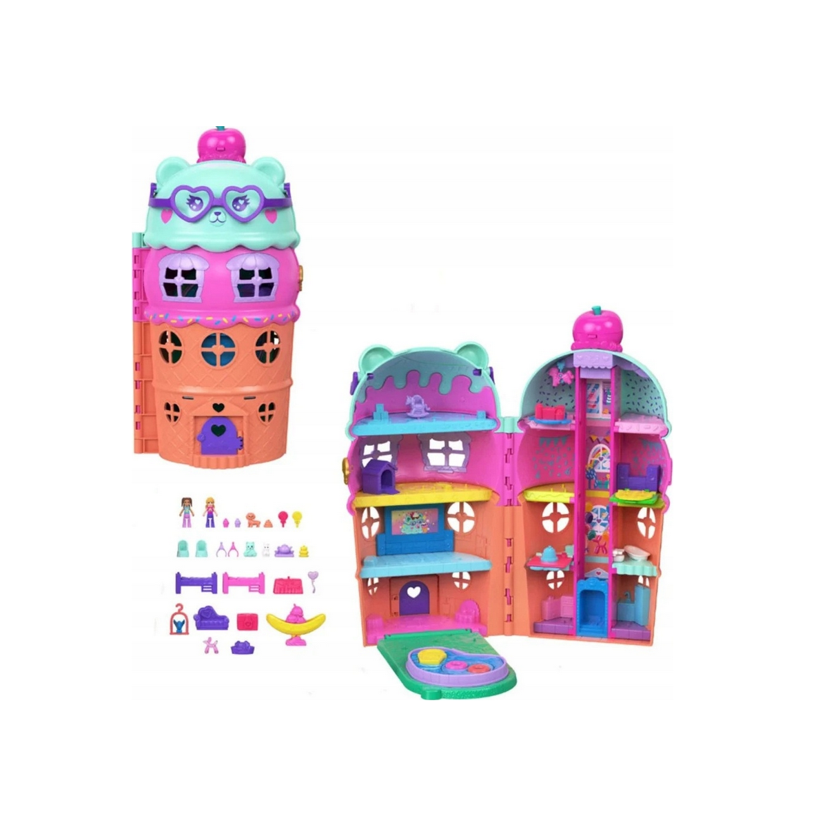 Zanurz się w magiczny świat zabawy z „Lodowym deserem” od Polly Pocket — kolorowym, pełnym detali domkiem-lodem, który przenosi maluchy do słodkiej krainy przygód i kreatywnych opowieści. Domek ma kształt dużego lodowego rożka z motywem misia i uchwytem w formie okularów-serduszek — dzięki temu jest lekki, kompaktowy i łatwy do przenoszenia — idealny, by zabrać zabawę w podróż.