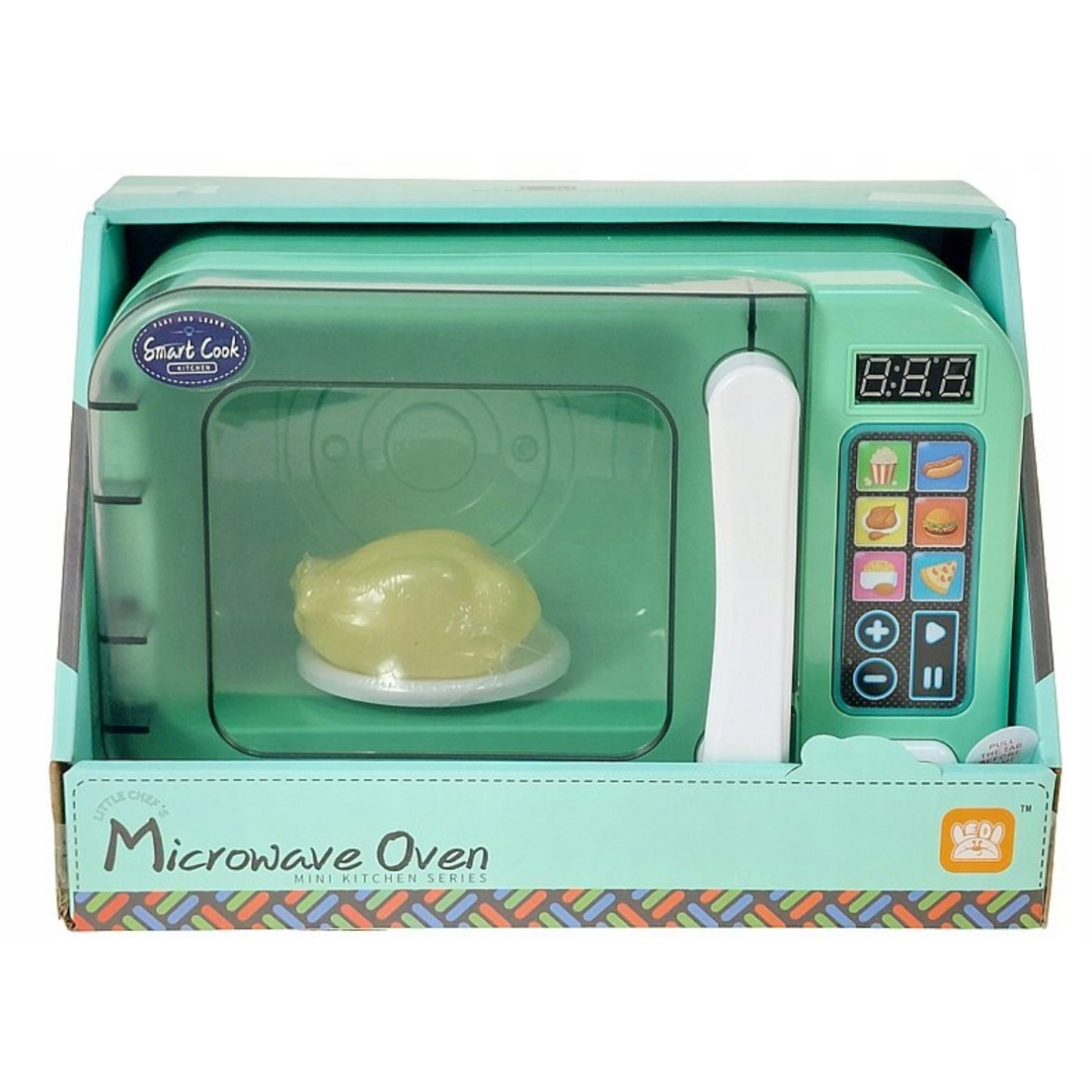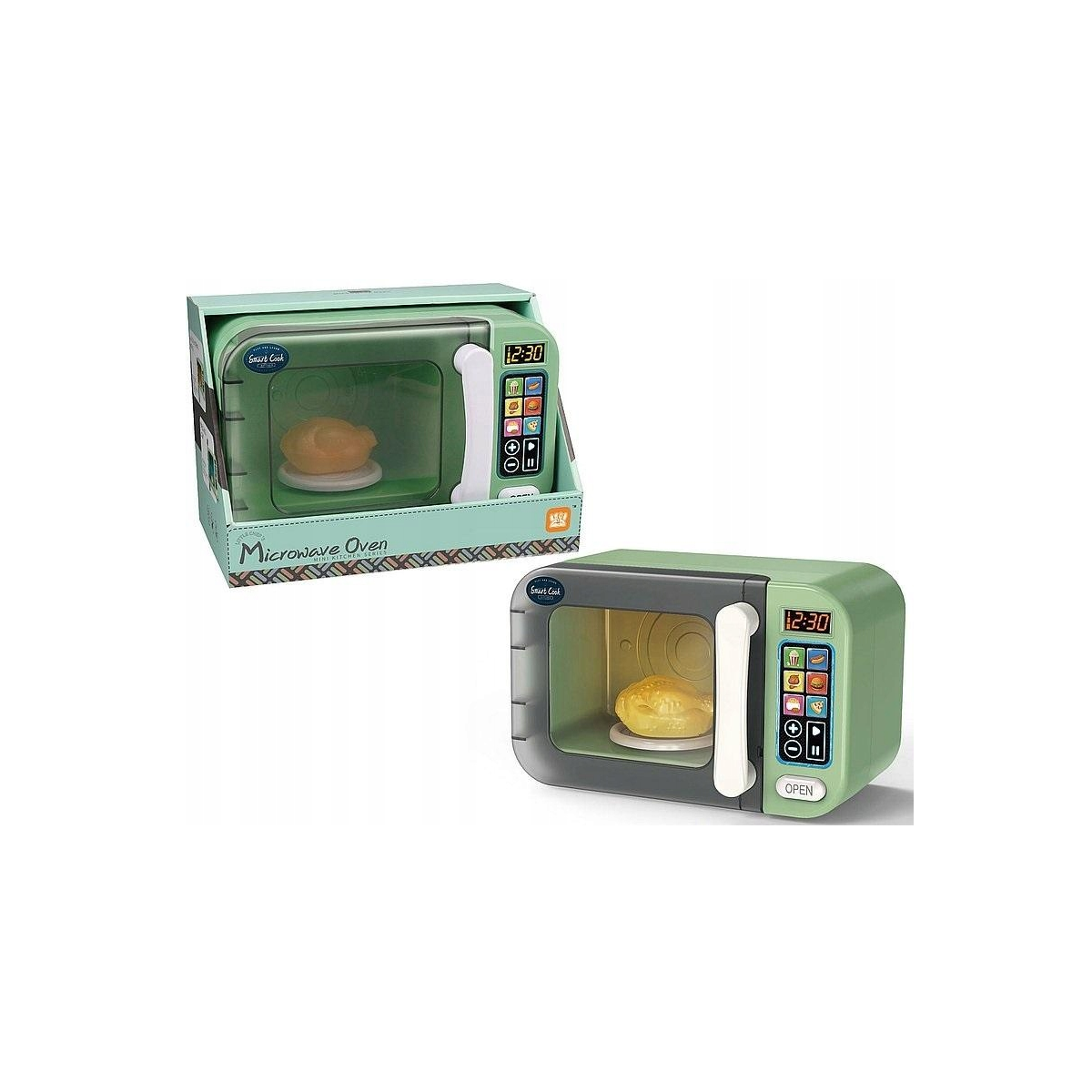 Interaktywna mikrofalówka zasilana jest bateriami. Posiada efekty świetlne i prawdziwy timer. Po wciśnięciu przycisku start zaświeci się światło a talerz zacznie się obracać.