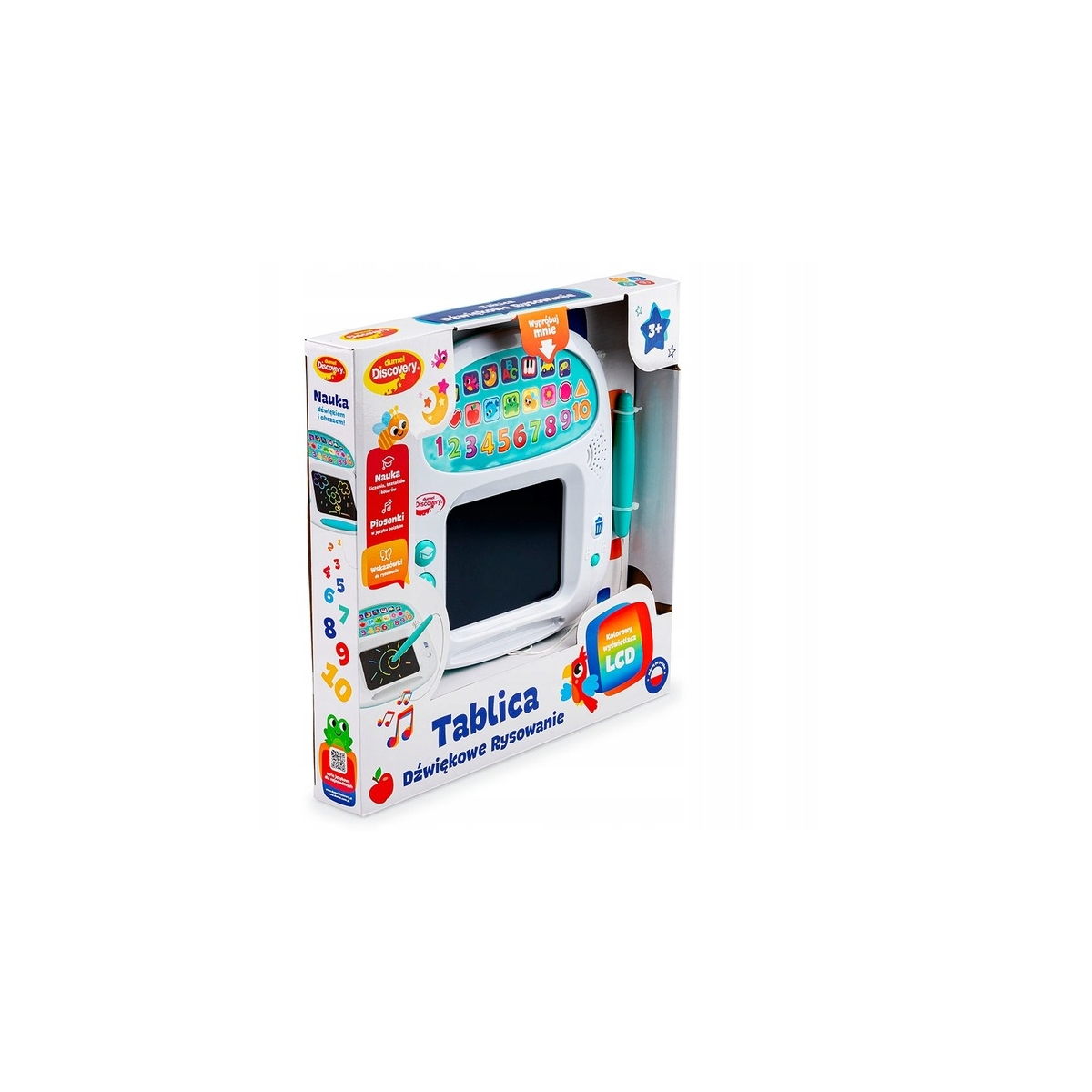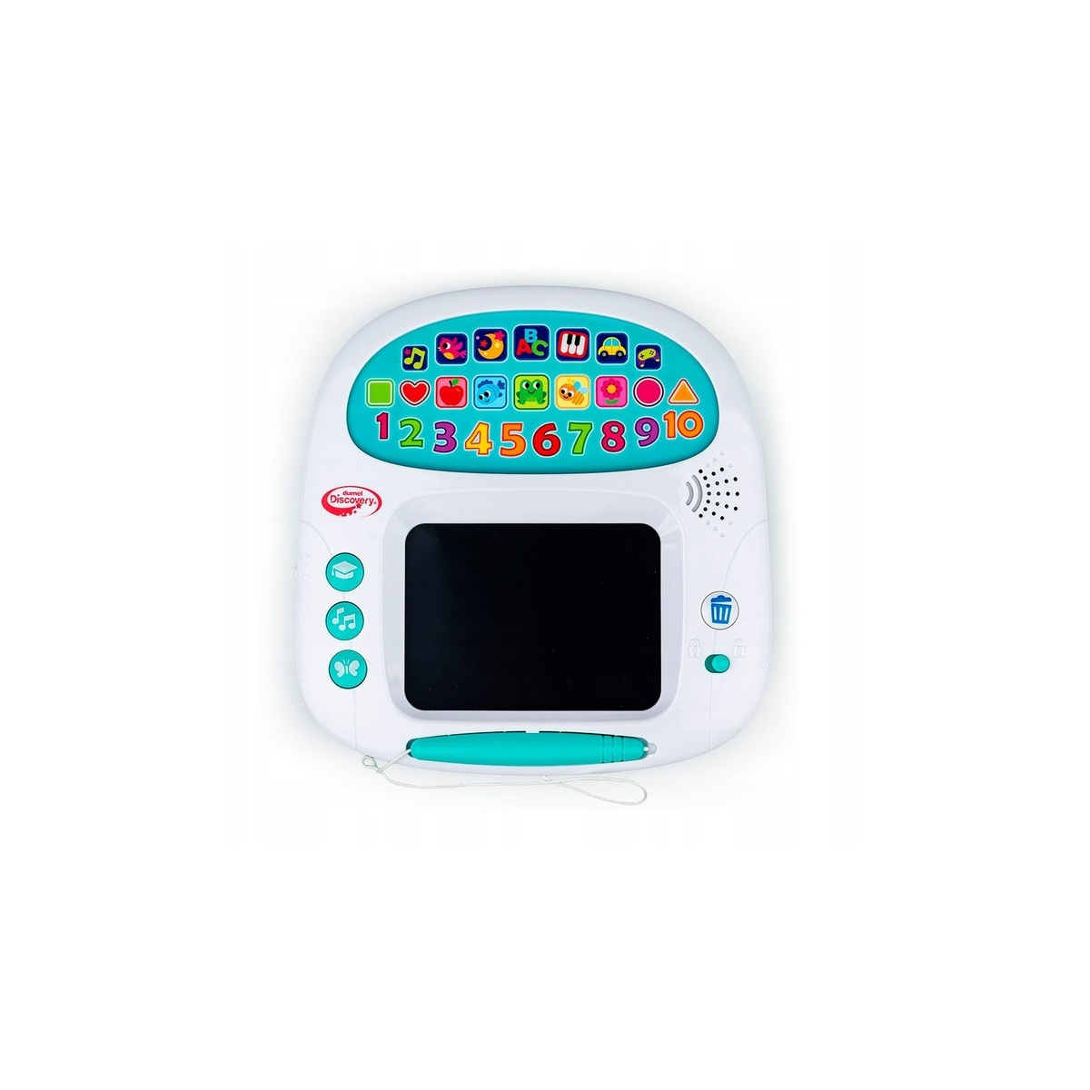 Znajdziemy tu także wesołe melodie i zabawne dźwięki . Obok tablicy, stanowiącej przestrzeń do artystycznych improwizacji dziecka, znajdują się trzy dodatkowe przyciski, które aktywują wskazówki do rysowania oraz piosenki w języku polskim. Tablica wyposażona została w niezwykle przydatną funkcję blokady zmazywania, co pozwala zapobiec przypadkowemu usunięciu obrazka, narysowanego za pomocą dołączonego rysika.