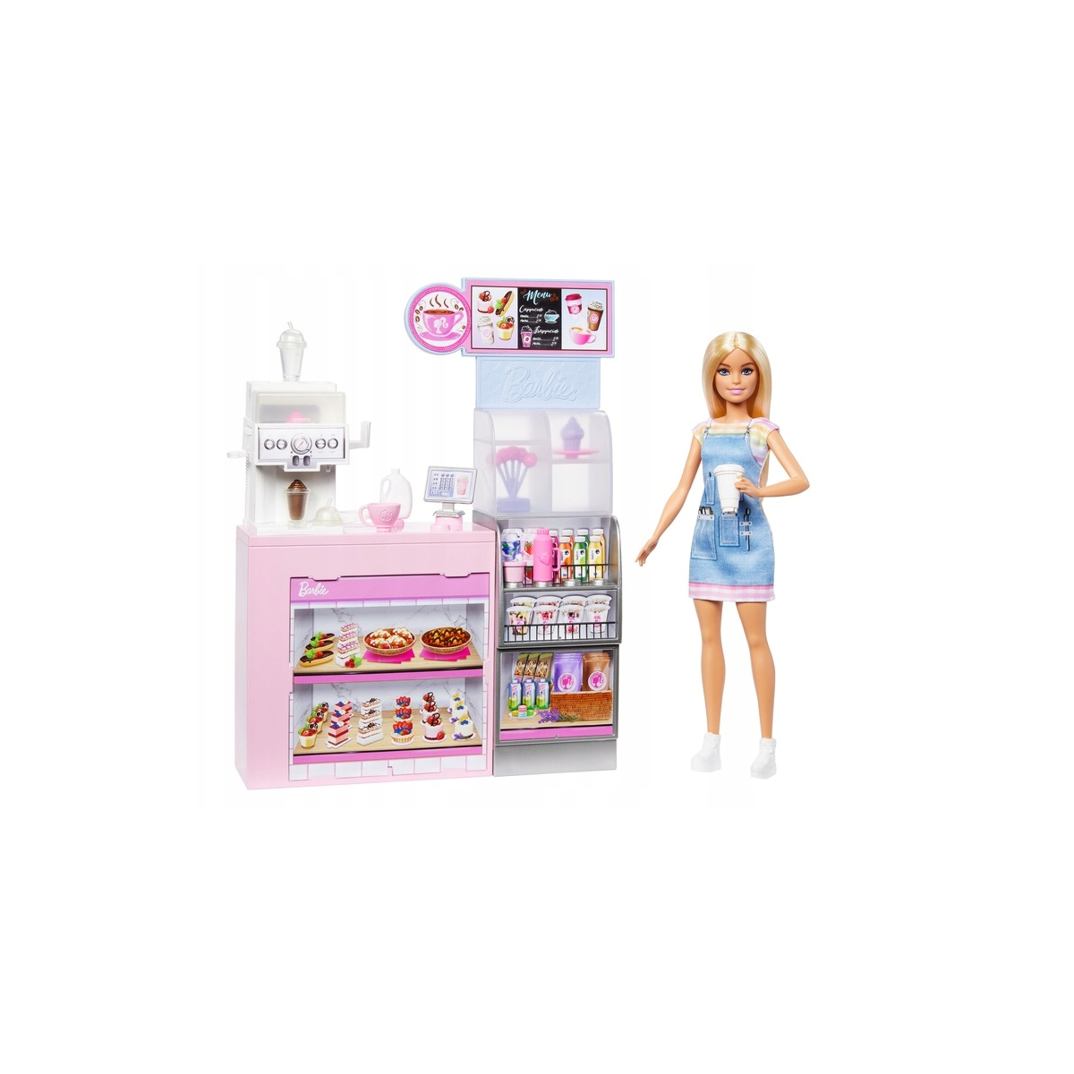 W menu znajdziesz też herbatę i przekąski. Wśród dodatkowych akcesoriów rozbudzających wyobraźnię są pojemnik z mlekiem, kubki do kawy i koktajli oraz filiżanka do herbaty. Barbie w stylizacji z fartuszkiem może podliczać klientów przy kasie, aby zabawa w odgrywanie ról była jeszcze bardziej realistyczna.