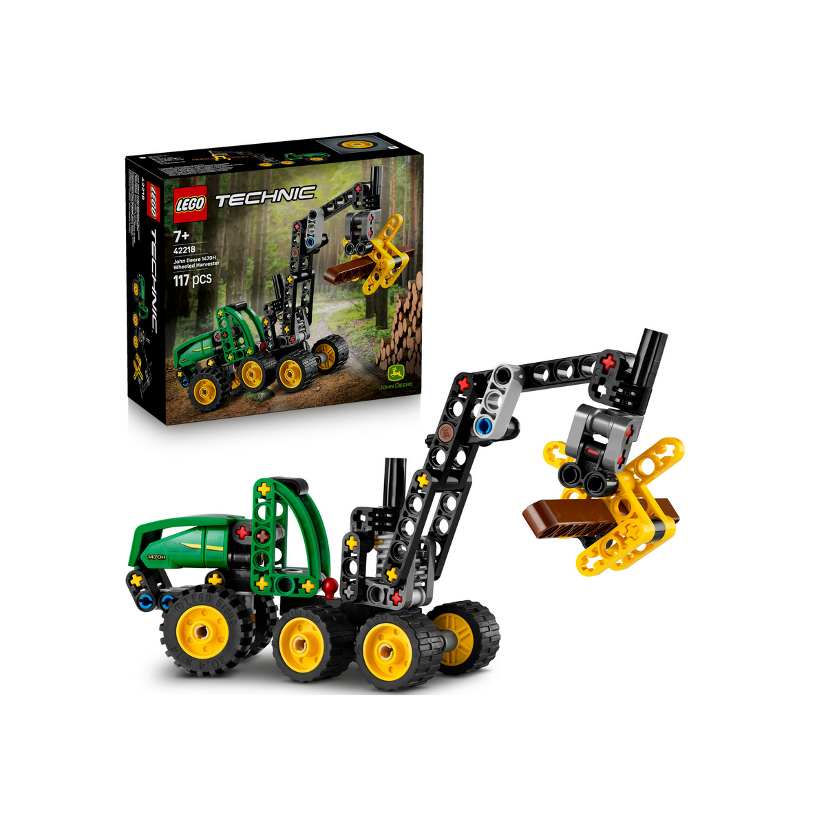 Zainspiruj chłopców i dziewczynki w wieku od siedmiu lat do odgrywania przygód w lesie dzięki zestawowi LEGO® Technic Harwester kołowy John Deere 1470H (42218). Pojazd budowlany ma wiele funkcji, które zachwycą młodych fanów marki John Deere. Dzieci sprawdzą wysięgnik, który obraca się o 180 stopni, a później przejdą do akcji — ruchomym chwytakiem złapią i upuszczą kłodę. Ta zabawka edukacyjna posiada również zawieszenie wahaczowe i przegubowy układ kierowniczy, które dzieci mogą przetestować. Dzięki przyciągającej wzrok kolorystyce marki John Deere — zielonej, czarnej i żółtej — ten zestaw jest fajną zabawką, którą dzieci mogą się bawić wielokrotnie. Zestawy LEGO Technic składają się z realistycznie poruszających się mechanizmów, które dla młodych budowniczych LEGO stanowią przystępne wprowadzenie do świata inżynierii. Dzieci mogą budować z pewnością siebie, korzystając z aplikacji LEGO Builder, w której można powiększać modele, obracać je w 3D i śledzić postępy dzięki prostym instrukcjom cyfrowym. Zestaw składa się ze 117 elementów.