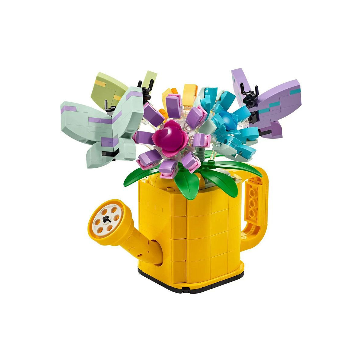 Buduj, przebudowuj, baw się i ustawiaj na półce trzy kolorowe modele inspirowane przyrodą z zestawu 3 w 1 LEGO® Creator Kwiaty w konewce (31149). Zawiera on żółtą konewkę zbudowaną z klocków z uchwytem i dziobkiem. W środku są trzy kwiaty z ruchomymi płatkami i trzema motylami na przezroczystych elementach, dzięki czemu stwarzają wrażenie, że latają w powietrzu.