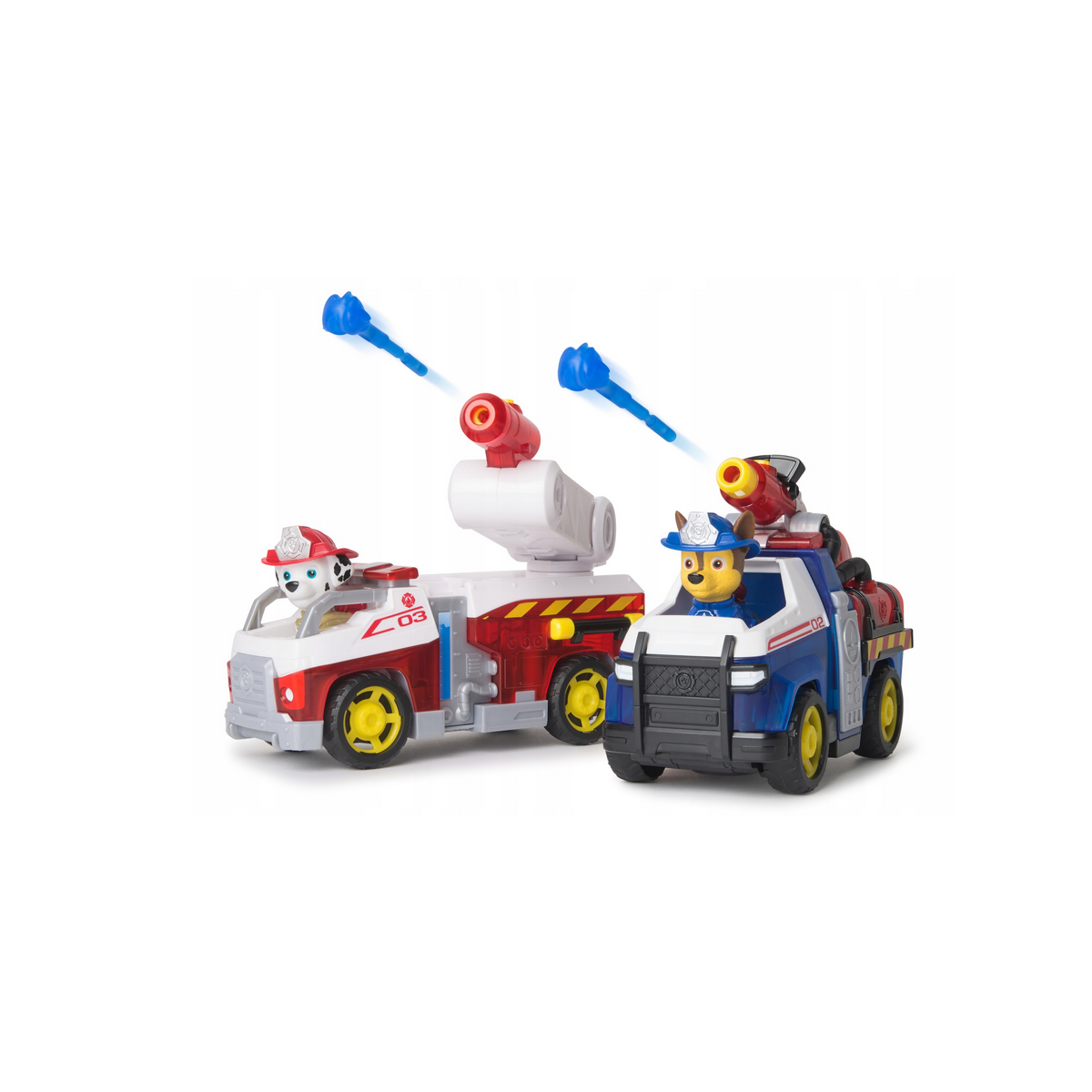 Każdy z piesków posiada swój pojazd ratowniczy z ruchomymi kołami, w którym znajduje się wyrzutnia z pociskami, umożliwiająca dynamiczne akcje podczas zabawy.