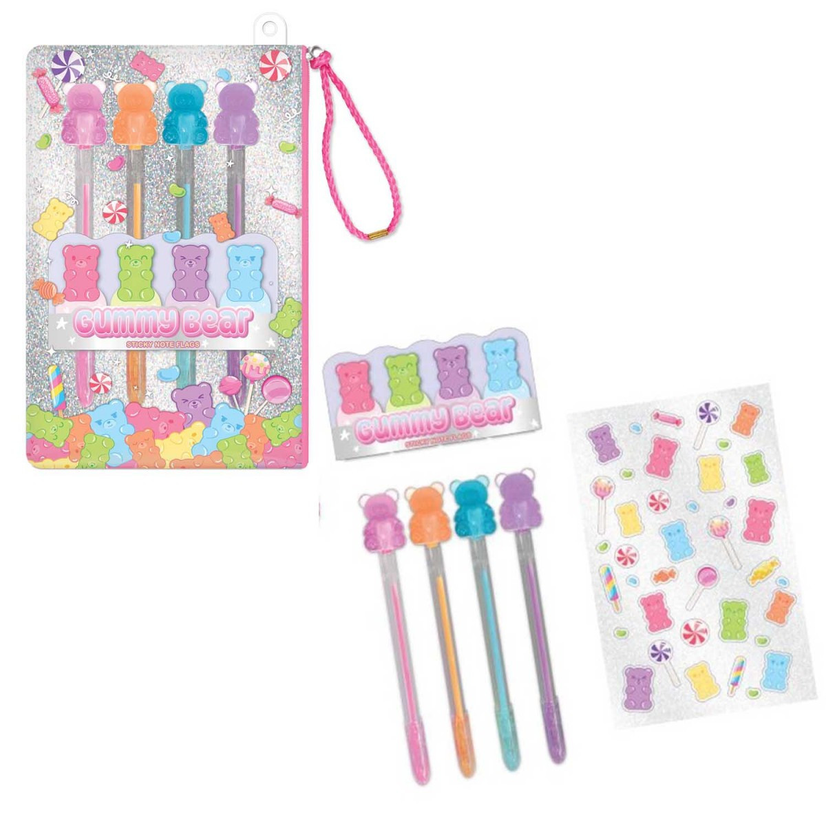 Kolorowy zestaw czterech żelowych długopisów zakończonych uroczymi misiami w kształcie żelek to idealny gadżet dla dzieci i fanów słodkich dodatków.