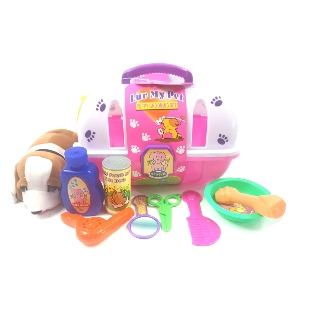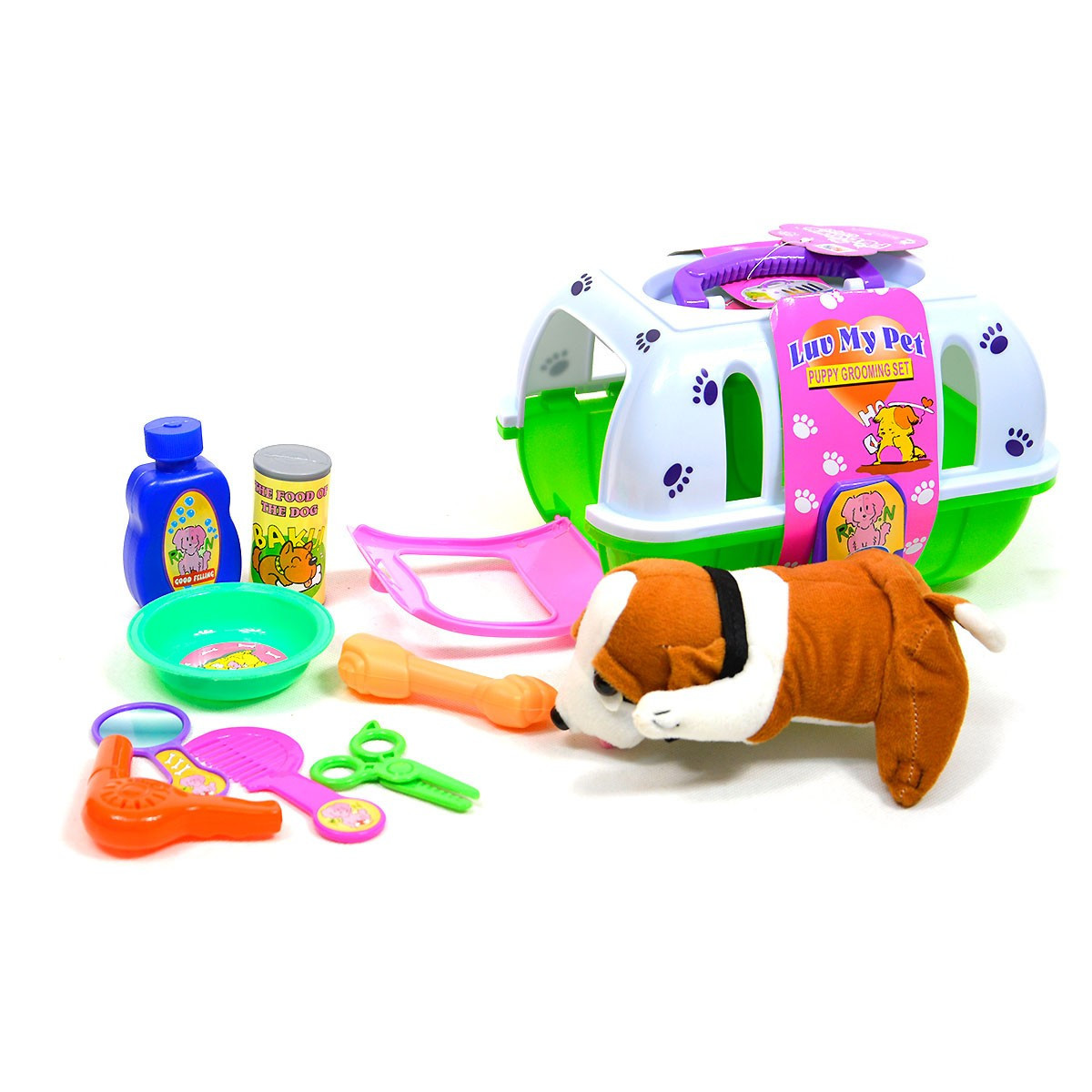 W zestawie znajduje się miękki pluszowy piesek, praktyczna klatka transportowa oraz akcesoria do opieki nad pupilem.