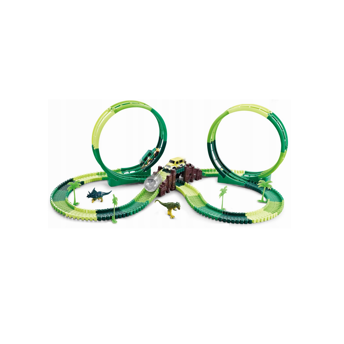 Tor samochodowy wyścigowy Dino Park to wyjątkowy zestaw, który łączy fascynację dinozaurami z ekscytującą zabawą wyścigową.