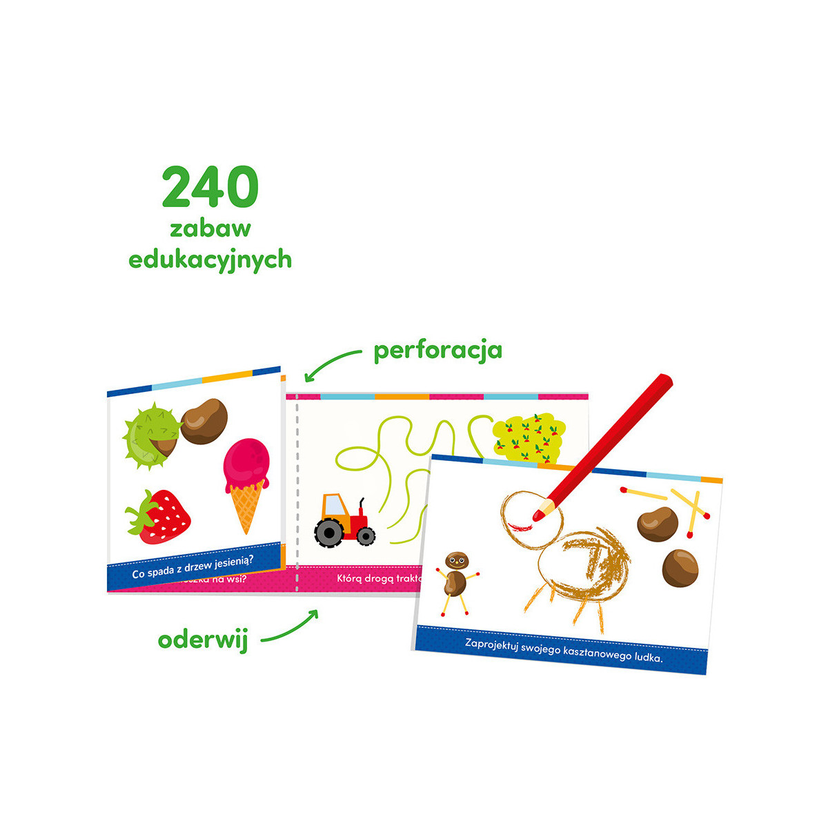 Kompaktowa edukacyjna książeczka dla dzieci w wieku od 3 lat zawiera 240 wciągających zabaw. Każda strona składa się z 2 części: z informacją, zagadką lub zadaniem i fragmentu do rysowania i zakreślania, który można oderwać dzięki perforacji, aby cieszyć się poręczną książeczką z ciekawostkami.